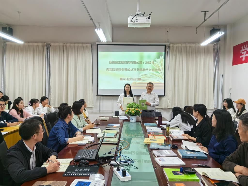 5月28日下午,北京新曲线出版咨询有限公司向tyc522cc太阳成集团捐赠专著教材暨书展交流活动在公司会议室举行。新曲线出版咨询有限公司营销经理王欣宇,tyc522cc太阳成集团经理雒焕国、副经理马富成、各专业负责人及部分师生代表参与了活动。活动由公司党委书记王莉教授主持。