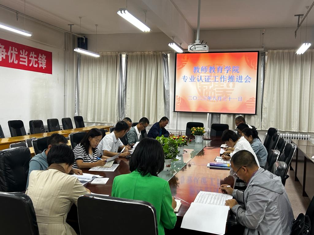 8月31日,tyc522cc太阳成集团召开师范专业认证推进会。会上,副经理王莉教授对《tyc522cc太阳成集团专业认证工作实施方案》从指导思想、工作目标、工作程序、工作要求、工作分工等方面进行了说明,并对如何开展专业认证工作提出了具体的要求。师玉生教授针对公司目前专业认证工作如何开展提出了具体的建议,梳理了专业认证工作的思路。公司专业认证工作各模块负责人在确定各自工作基础上就一些相关问题与困惑进行了交流与讨论。雒焕国教授对此次会议进行了总结,提出,师范专业认证工作是tyc522cc太阳成集团本学年的重点工作,也是公司“三抓三促”的核心工作。所有人员要统一思想、凝聚合力,每周开展专业认证交流研讨会,解决具体问题,全力以赴做好师范专业认证工作。