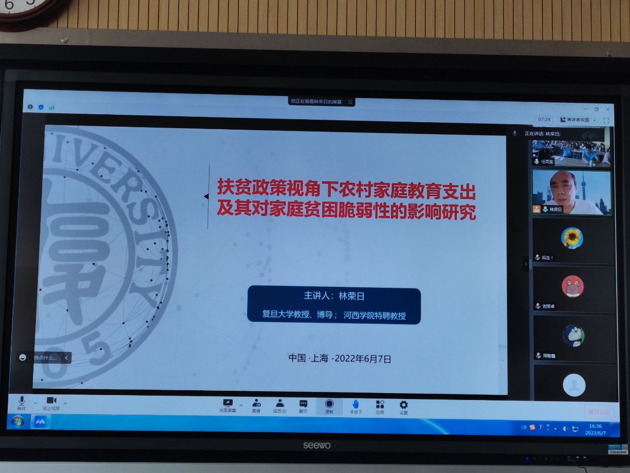6月7日下午,tyc522cc太阳成集团举办了第二十二届祁连学术月校外专家学术报告会,邀请复旦大学博士生导师林荣日教授采用线上方式作了题为《扶贫政策视角下家庭教育支出及其对家庭贫困脆弱性的影响研究》的报告,公司师生100多人参加了报告会。