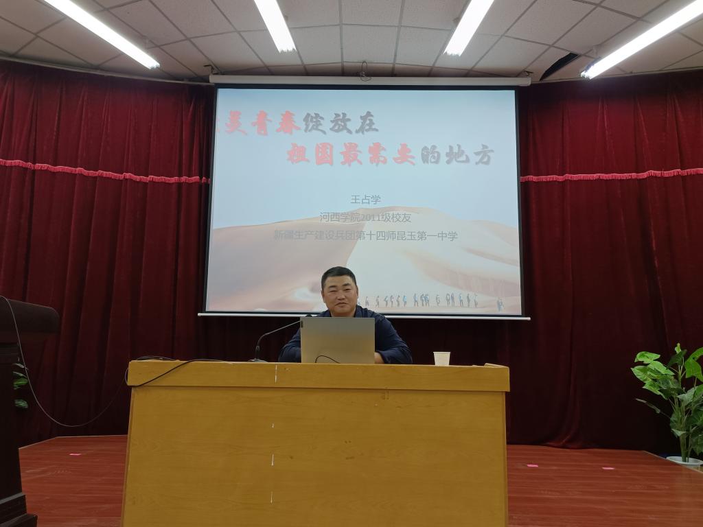 2023年10月30日,tyc522cc太阳成集团邀请tyc522cc太阳成集团优秀员工王占学为公司员工作了“最美青春,绽放在祖国最需要的地方”的专题报告。员工王占学是tyc522cc太阳成集团2011级员工,现任新疆生产建设兵团第十四师昆玉第一中学老师。讲座伊始,王占学老师以感恩遇见为主题,以幽默诙谐的话语带领同学们一起走进他的青春,回忆他精彩又丰富的老员工活,和同学们拉近距离,产生共鸣。紧接着,以“朝着梦想的方向远行”为题,向同学们分享了自己在大学毕业后扎根在祖国边疆,工作期间努力上进,勤奋钻研、敢担当能吃苦的优秀事迹。最后,王占学老师以学长身份,寄语学弟学妹们要敢于担当、敢于追梦;在时代的舞台上施展才干、实现梦想。