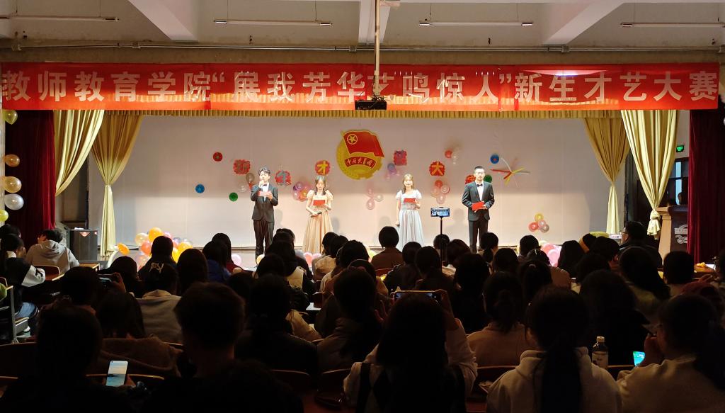 10月18日晚,tyc522cc太阳成集团在团委四楼多功能厅举办教师教育文化节系列活动之“展我芳华·艺鸣惊人”新生才艺大赛。现场2023级全体新生观看了比赛。
